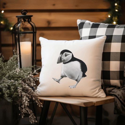 Faux Suede Puffin Cushion – Hand-Drawn Coastal Bird Home Décor