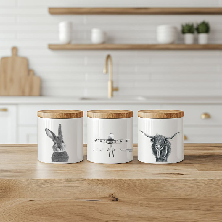 Bring beauty and character into your kitchen with our collection of hand-drawn bone china storage jars. Each design begins as a calming sketch by Skip, whose meditative drawing practice transforms everyday moments into elegant, heartfelt art. Crafted with care and proudly made in the UK, these jars are perfect for storing tea, coffee, sugar, or biscuits while adding a touch of charm to your home. From busy bees to Highland cows, Concordes to peeking cats, each piece celebrates the small joys of daily life through thoughtful, timeless illustration.
